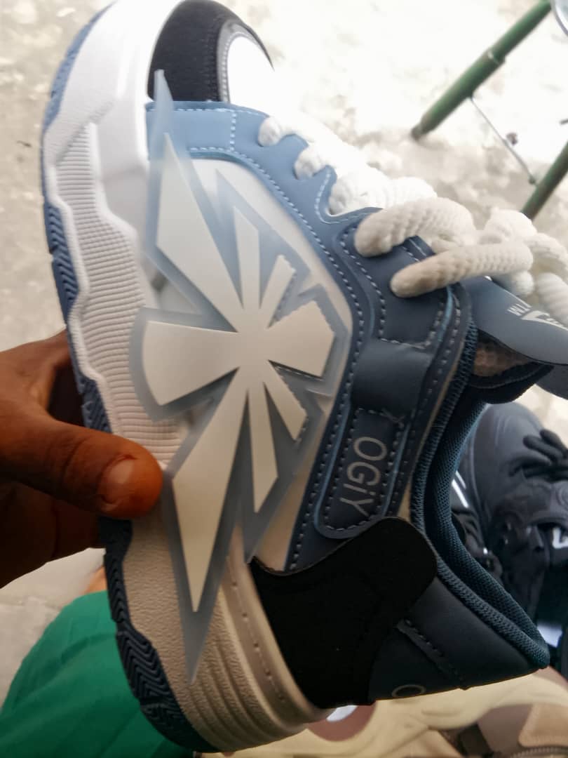 This is a modern athletic sneaker featuring a bold white starburst logo on the side panel, set against a blue and black upper with white accents. The chunky, textured sole provides cushioning and grip, while the padded collar and tongue ensure comfort. A hand holds the shoe, showcasing its design details, including the "OGY" branding on the tongue and heel tab. The overall look combines futuristic styling with functional sportswear elements, suitable for casual or active use.