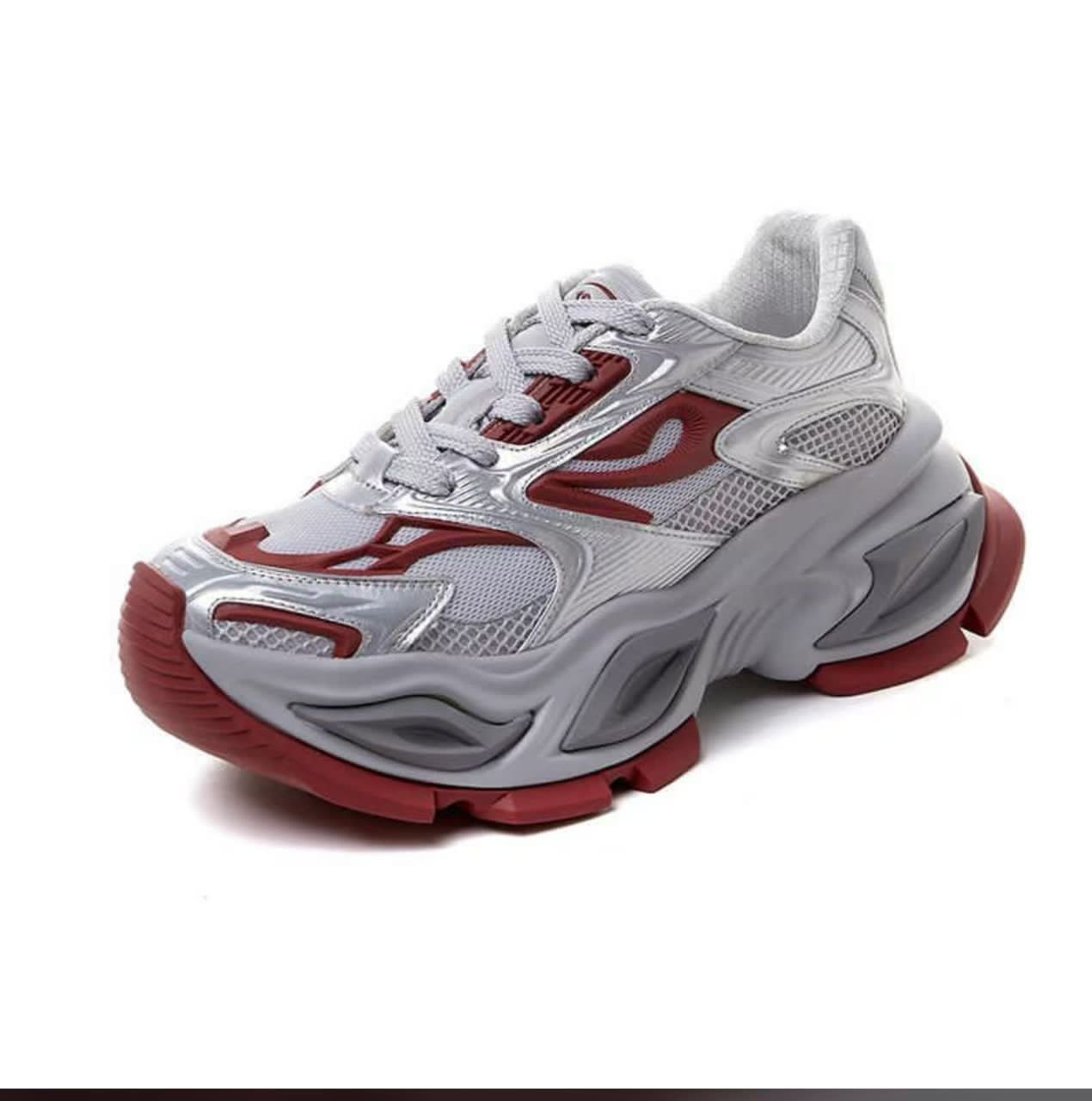 Futuristic silver-and-red chunky sneaker with mesh upper, metallic accents, and cushioned thick sole.