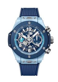 An image of a blue Hublot-style chronograph wristwatch featuring a large case, multi-layered skeleton dial, and a rubber strap. The watch has a sporty, bold aesthetic with light-blue and dark-blue color accents