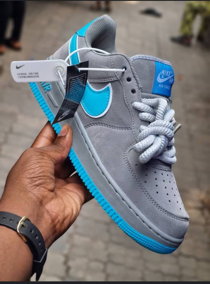 Grey suede Nike Air Force 1 Low customized with vibrant turquoise accents, oversized white rope laces, and a matching blue outsole for a bold, street-ready look.