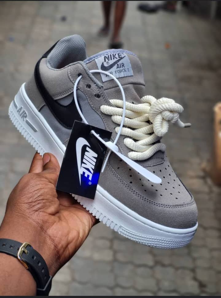 This is a modern custom take on the classic Nike Air Force 1 Low. The upper is built from premium grey suede (often called "Grey Fog" in sneaker circles) paired with a sharp black leather Swoosh for high-contrast pop. It features oversized cream/off-white rope laces that give the shoe a chunky, trending look that's dominant in current streetwear and custom culture. The midsole and outsole remain classic white, keeping the silhouette clean and versatile while the thick laces add volume and texture. Standard AF1 details are intact: perforated toe box for breathability, padded collar, "AIR" branding on the midsole, and the iconic tongue label. Comes with retail-style tags, indicating it's a high-quality custom or aftermarket pair rather than an official Nike release.