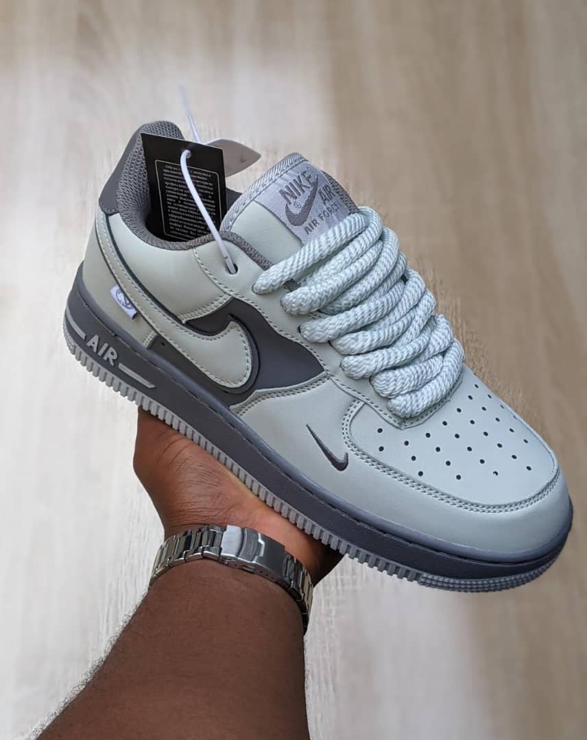 Silver-grey AF1 customs featuring dual Swooshes, chunky rope laces, and an icy blue sole — ultimate clean and icy vibe.