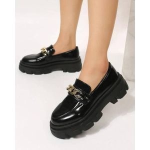 Black patent chunky loafers with gold chain detail and a thick non-slip sole for stylish everyday wear.